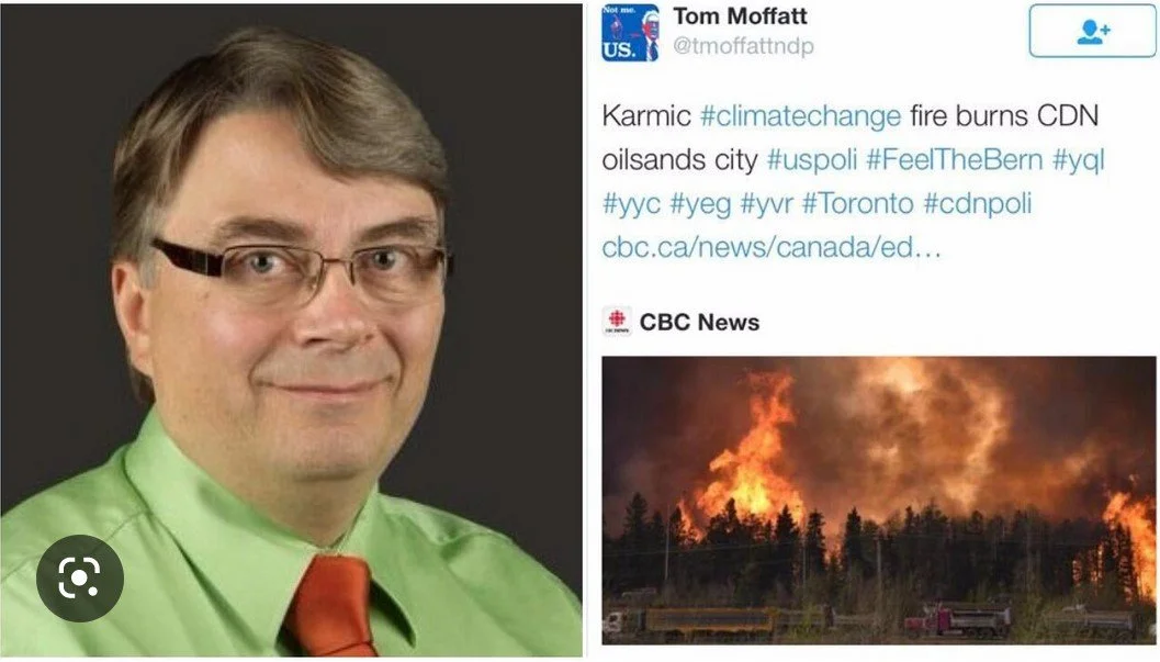 The very least this asshole should get is fired. He should, at the very least, lose one thing that 80,000 people in Fort Mac have lost: their jobs. Their way to earn a living. Their way to take care of their families. Their route to replacing everything that was destroyed. He sees ‘karma’ because of global warming? He, like many people, misunderstand karma. It is inherent. It is intrinsic. It is collective over lifetimes. To Tom Moffat’s logic, the happiest man in Fort Mac whom everyone in town would describe as a ‘good man’ or a ‘pious Christian’ or place your positive description here, deserves to have his life destroyed because he drives a truck full of clean sand back from restoration plant to the reclamation land to be sculpted over the stripped-mined face of the earth. This figurative man, who makes a living turning the earth back into a beautiful landscape that all Canadians desire and appreciate, is guilty as charged for committing global murder: the paramount crime of contributing to climate change.